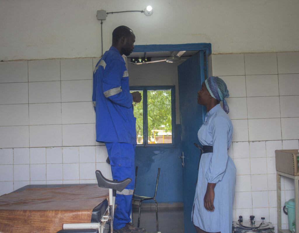 Mariam Niaré, Yeelen Kura technician, doing maintenance work on a solar home system at a customer's home in Nimbougou, Mali.